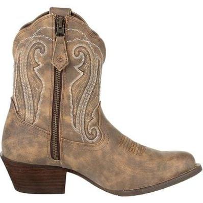 This is the women's 8" Shortie Driftwood Durango® Crushâ¢. This style is faux leather, has a soft mesh lining inside and features a removable Durango® Sole Comfort footbedâ¢. It has a steel shank, single row sole stitch, rubber outsole with vintage finish, medial side zip for easy on/off, 1 ¾" heel and an R toe. Step out in style in this women's 8" Shortie Driftwood Durango® Crush⢠style. Get a pair today!