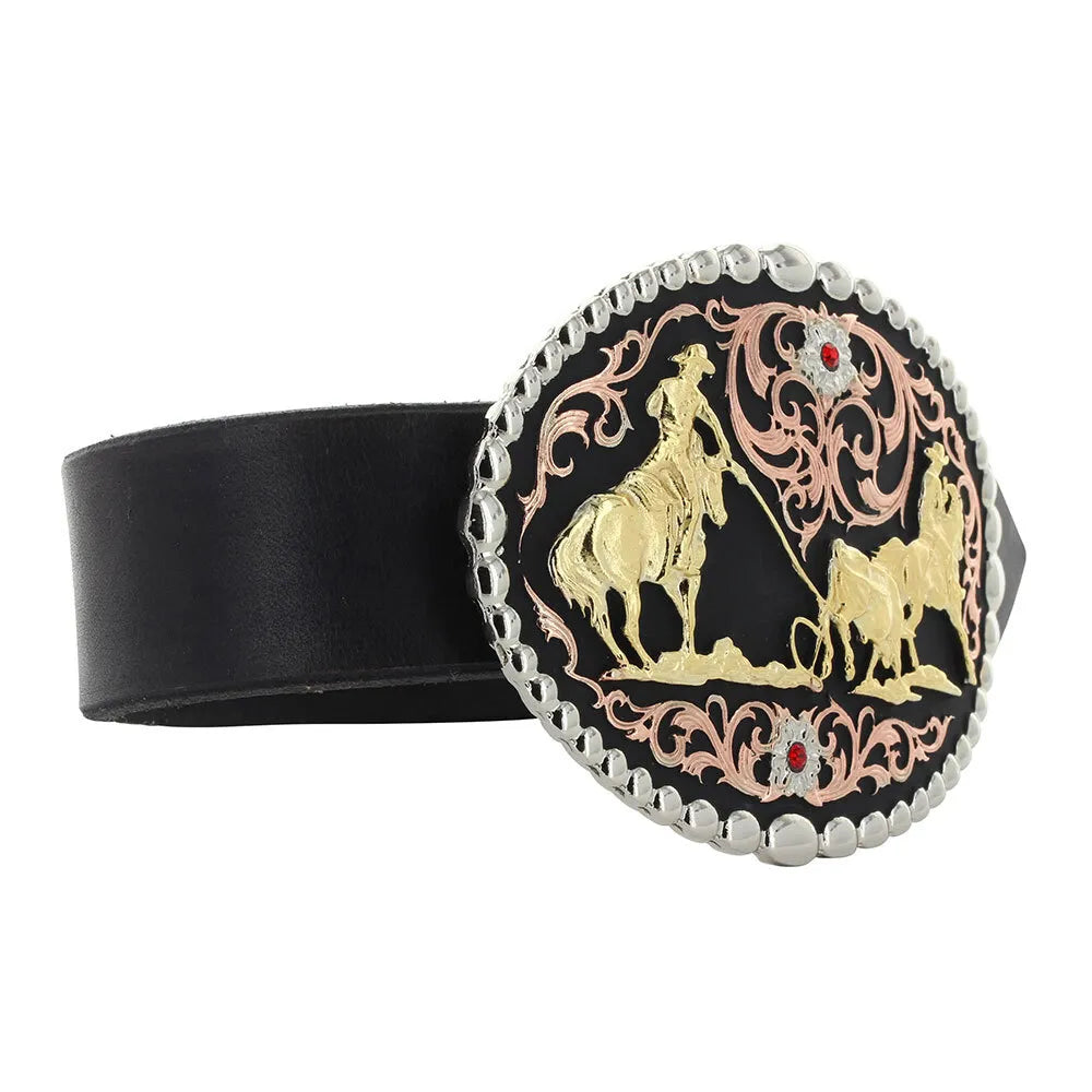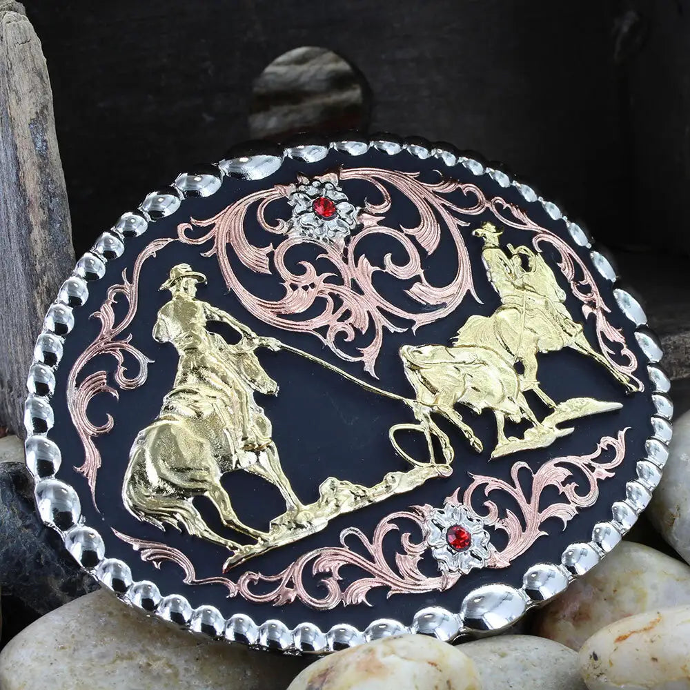Cowboys can accomplish anything when they work together. Revel in your cowboy spirit with this tri colored Attitude buckle featuring a large figure of team ropers. This oval shape belt buckle is framed with a string of high dome polished beads and filled with copper filigree accented with two flowers set with ruby colored stones at the top and bottom. Hand-painted black. Each finish may vary slightly due to the hand finished nature of each buckle. Standard 1.5 inch belt swivel.