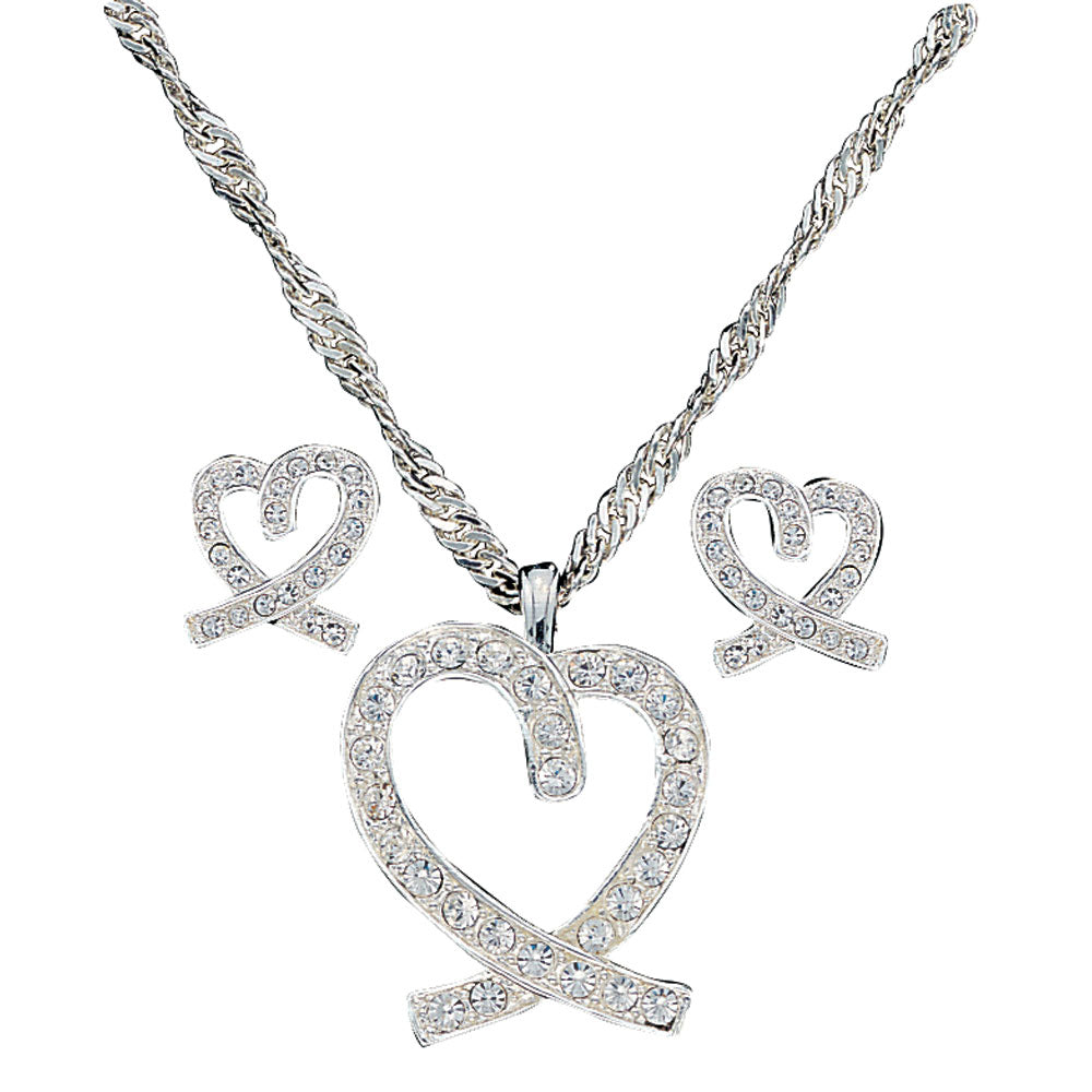 A caring heart is a heart shaped like a cause ribbon design with deep curl in the top and a ribbon crossed at the point. Encrusted with clear rhinestones. The post earrings are mirrored in design. Earrings measure 1/2 inch long. Silver necklace pendant measures 1 1/4 inch long. Silver chain: 16 inch plus 2 inch extender.