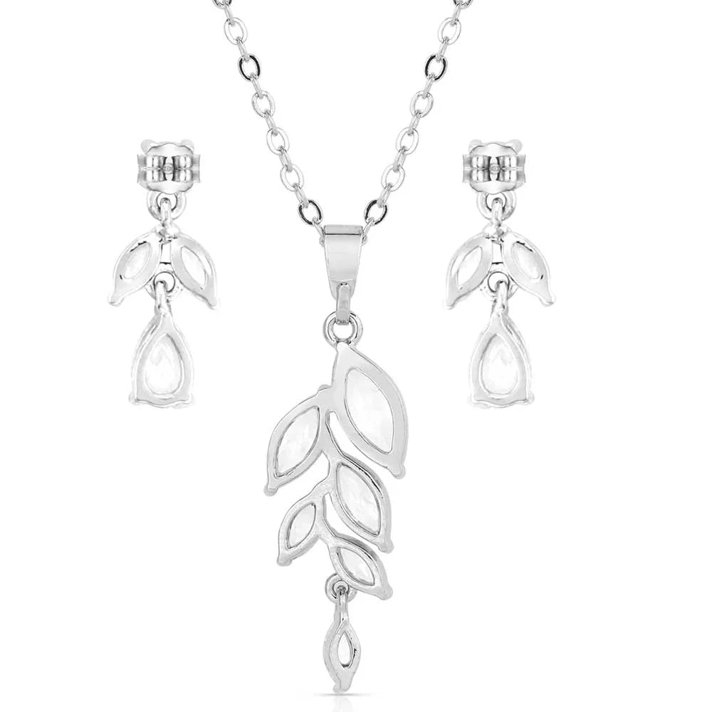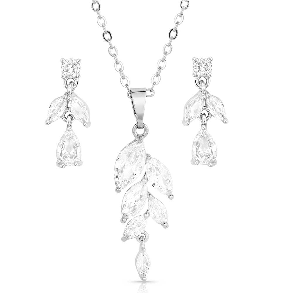 Delicate and sparkling, the Falling Petals Crystal Jewelry Set will add elegance and glamour to your look. The stunning design of the necklace and earrings features gorgeous clear cubic zirconia crystals that cascade down like the falling petals of a flower or a cascading waterfall. The necklace makes a subtle statement and hangs from an 18 inch silver tone chain. The matching earrings are secured by a hypoallergenic post wire for a seamless and cohesive look.