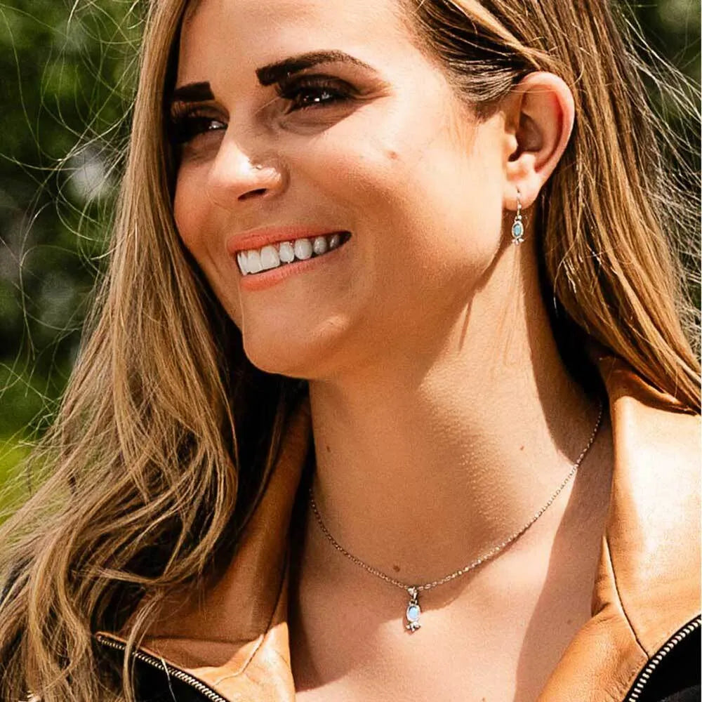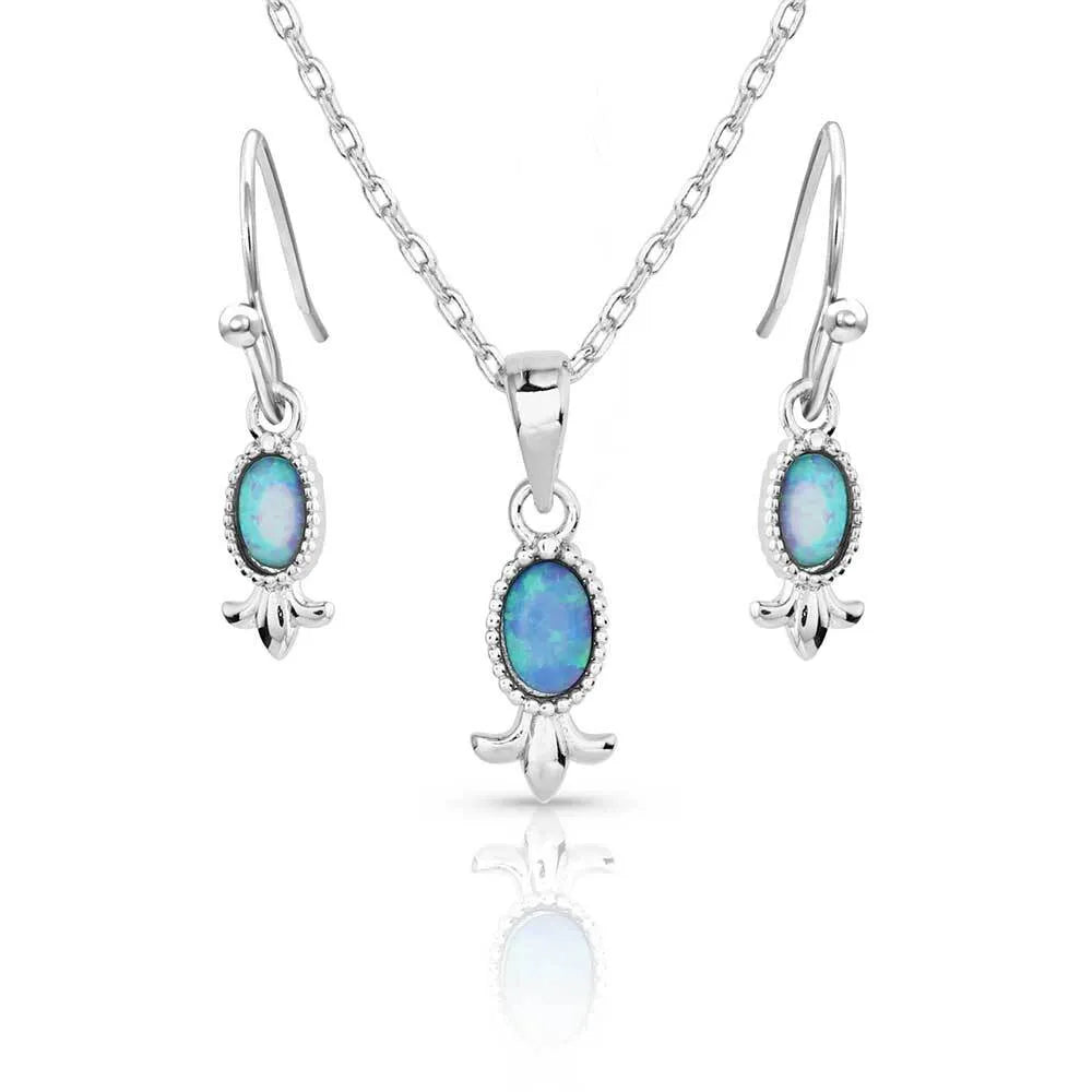 The dainty and delicate design of the Opal Flourish Jewelry Set is perfect for a minimalistic look. The set features an oval opal stone in the center. Below is a flourish of silver tone adding to the simple design. Hypoallergenic French wires secure the earrings, and the matching necklace hangs from an 18.5 inch adjustable silver tone chain completing the stunning jewelry set.
