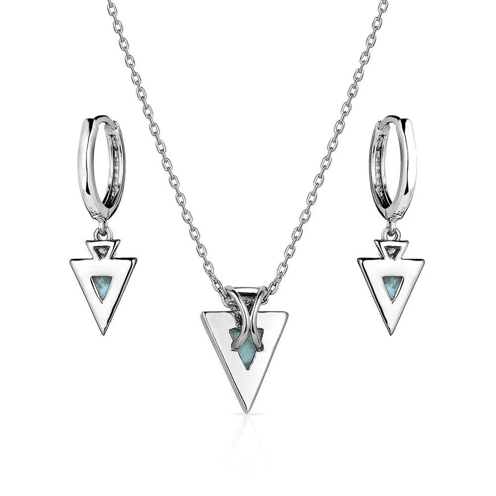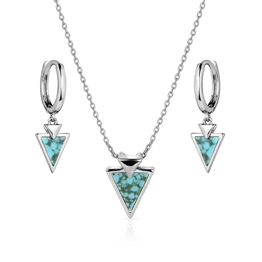 The Pointed Path Turquoise Jewelry Set is a stunning addition to your collection. The earrings hang from a hypoallergenic hinged clasp. Dangling below is a silver tone triangle shape adding movement to the design. In the center of the triangle is a bright turquoise stone. The same triangle shape is replicated in the pendant of the necklace which is secured by a 16 inch silver tone chain. Stone color may vary.