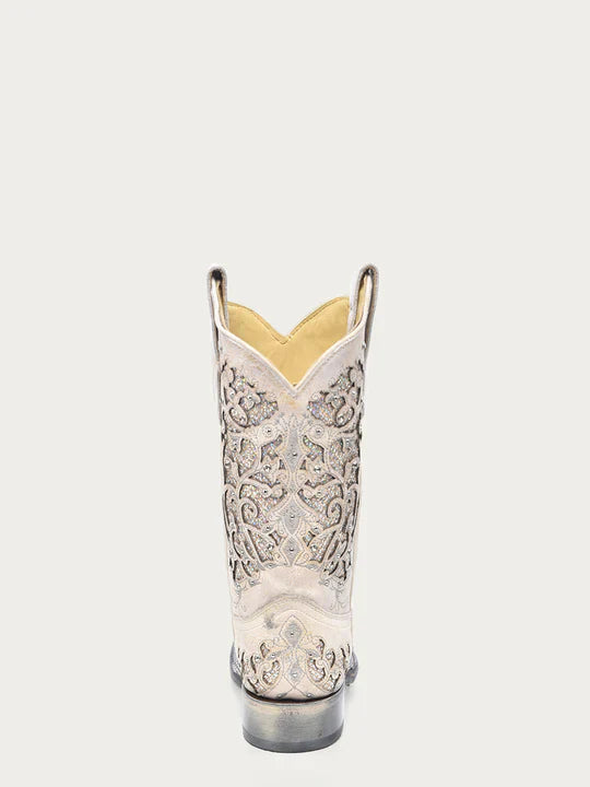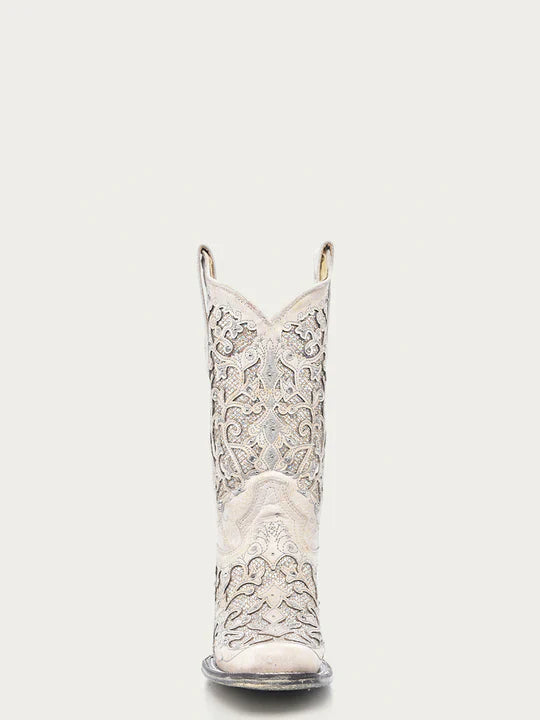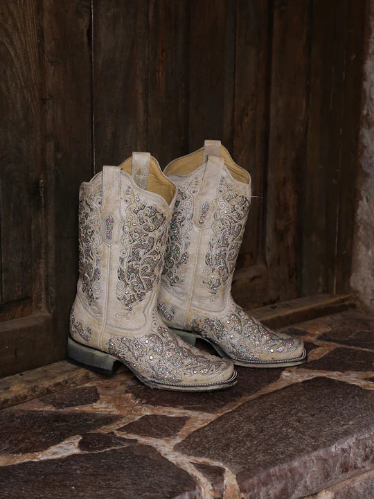 Its beauty is not only in its 11.5-inch shaft full of embroidery, glitter inlay, and rhinestones but also in its crackled leather finish, and in its white and dark grey weathered floral-designed sole.
