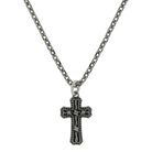 For a subtle necklace that shows what you believe this necklace is perfect. A deeply antiqued stainless steel cross pendant with a center barbed wire design and outer microbeads edge with an opera length 28 inch chain.