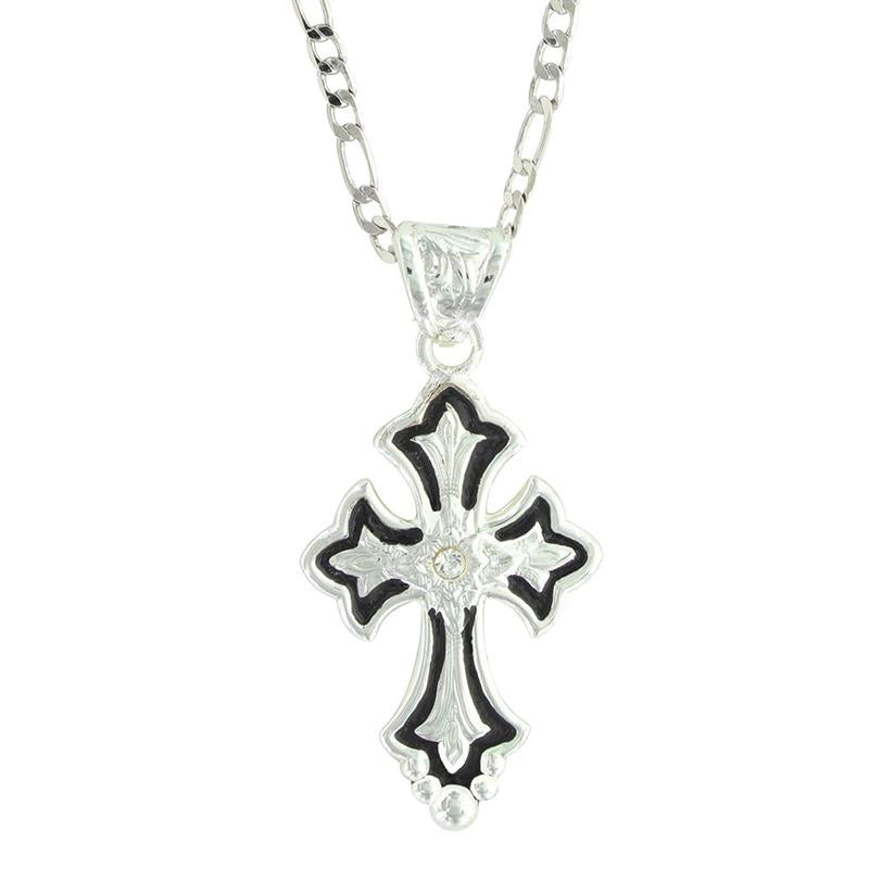 Montana Silversmiths brings you this new women's necklace! It features an engraved silver bale on an 18" chain and a silver Fleur de Lis cross pendant. Trimmed in polished silver wire, the black outline on the cross highlights the bright silver flower and elongated leaves in the center.