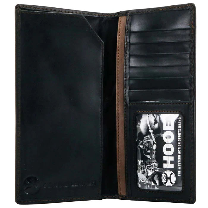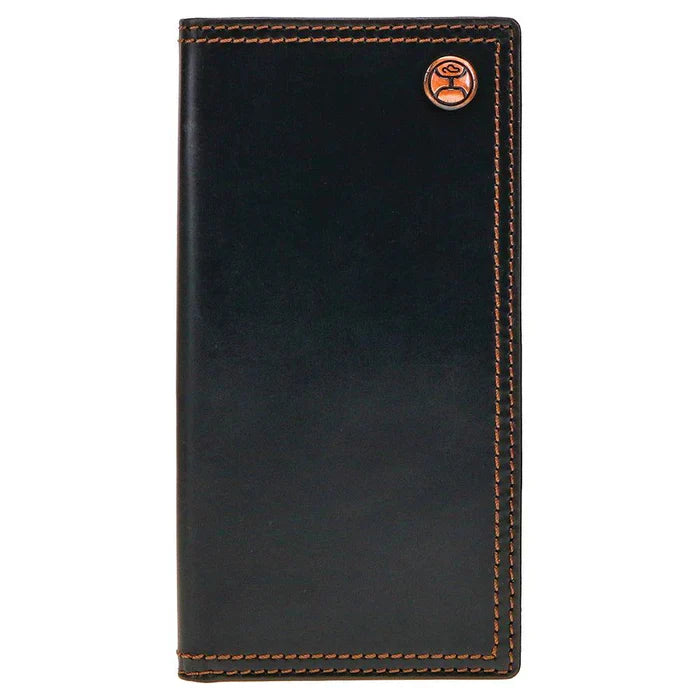 This Hooey rodeo wallet features a smooth black exterior and interior with a brown double-stitched accent edge and includes our custom hooey brand woven logo liner.