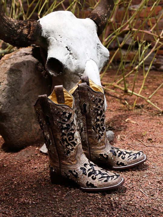 A3648 - WOMEN'S BLACK GLITTER INLAY FLORAL OVERLAY WITH CRYSTALS AND STUDS SQUARE TOE BROWN COWBOY BOOT