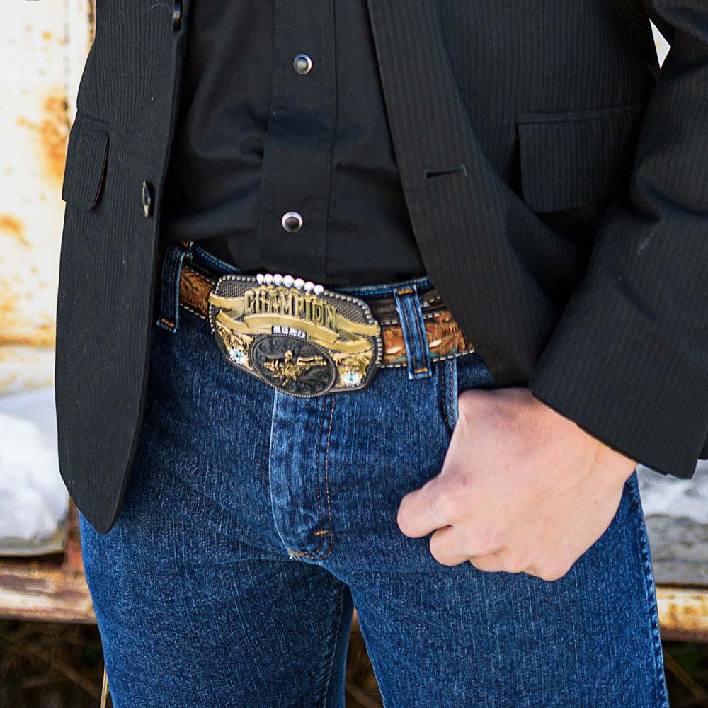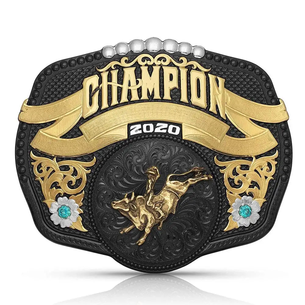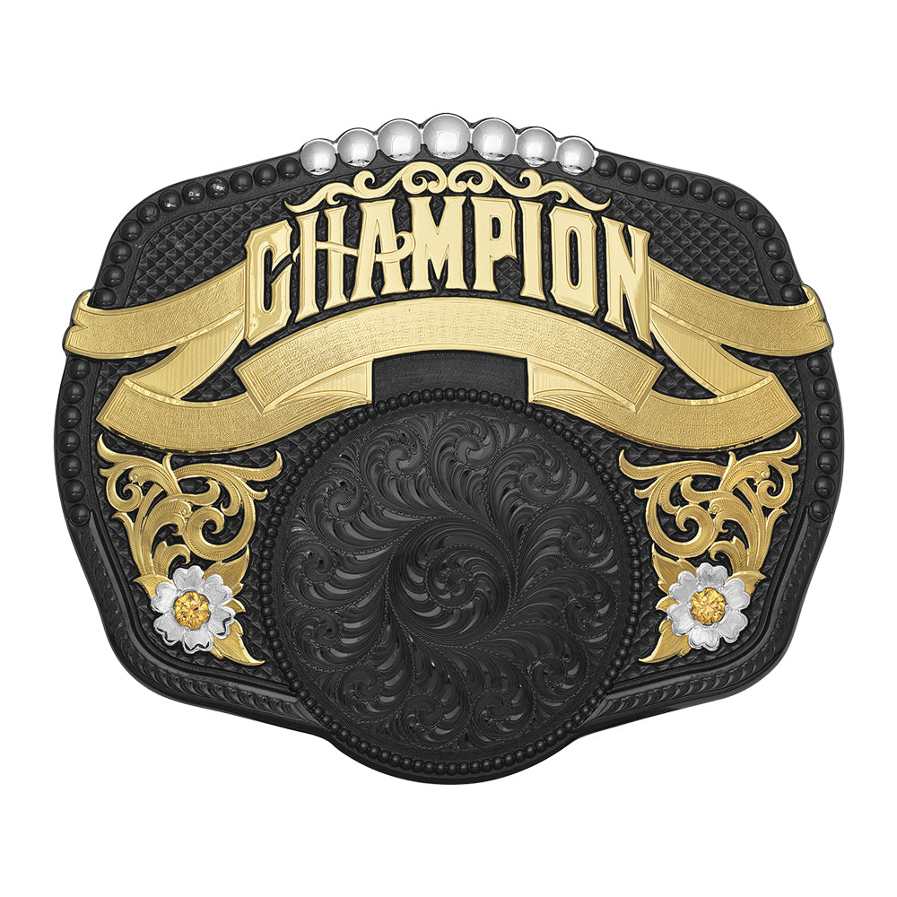An unusual tri-tone buckle, this overall gunmetal finished buckle has highlights of rich yellow gold finished details of ribbons and filigree design and large lettering along the top center spelling out "Champion". Bright silver finished details include a set of six high-domed beads a center curved date trim and two floral details on the lower left and right corner with a center stone of your choice. Buckle allows for 5 lines of engraving, with 7, 7, 16, 7, and 7 characters respectively (spaces included). Date trim option. Buckle is engravable on back for an added message. Standard 1.5 inch belt swivel.