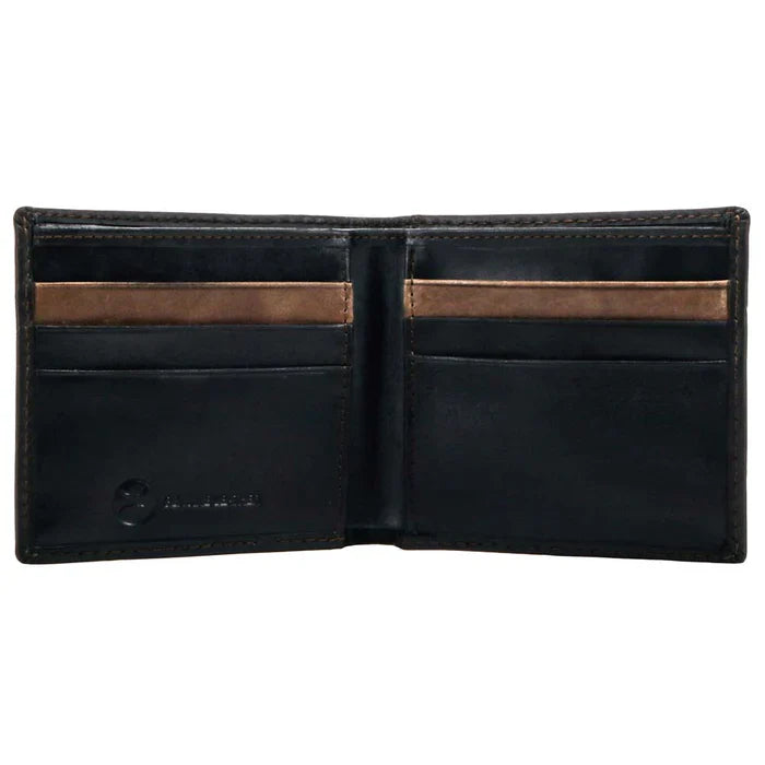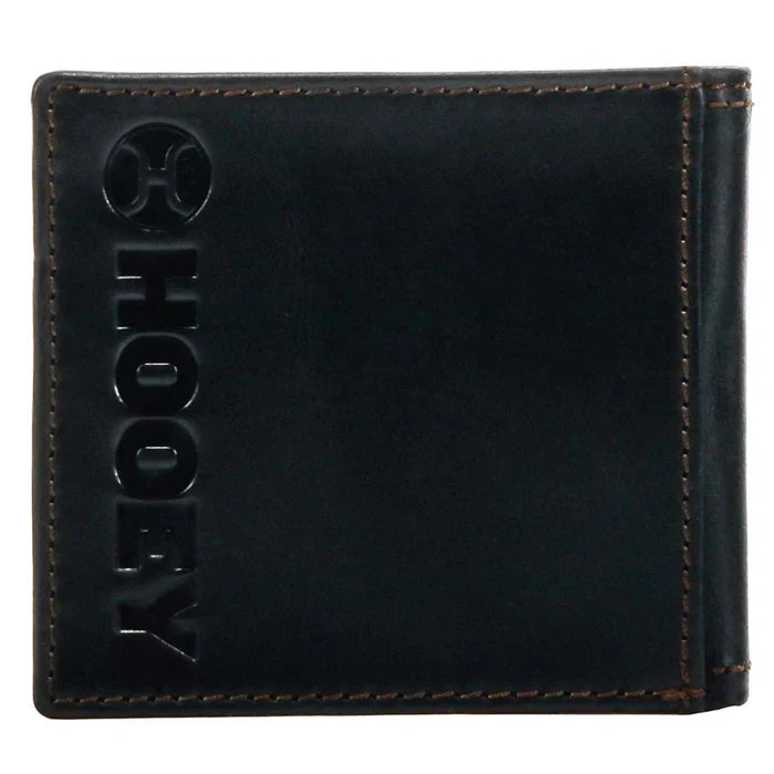 This Hooey bifold wallet features a smooth black exterior and interior with a brown double-stitched accent edge and includes our custom Hooey brand woven logo liner.