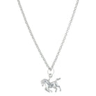 This delightful prancing horse charm necklace is sure to please everyone from the littlest horse lover to the biggest. The bright silver tone of the horse has delicate details that seek to capture that wonderful feeling when you see a horse running free across a field. Necklace charm hangs from a matinee length 21 inch chain.