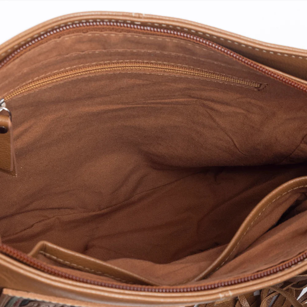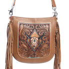 The Myra Spring Creek Hand-Tooled Bag is a stunning tribute to Western artistry. Crafted from rich chocolate leather, its hand-tooled front panel showcases a striking steer skull motif, embodying rugged charm. Elegant leather fringe cascades from each side, adding movement and flair. Designed for function, these hand tooled bags feature a secure zipper closure, a back zippered pocket, and a detachable, adjustable leather strap. A bold yet refined tooled purse for those who love Western elegance.