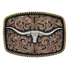 An antiqued Attitude buckle with a center silver tone elongated longhorn figure with rose gold toned filigree and yellow gold toned rope edging. 1.5 swivel.