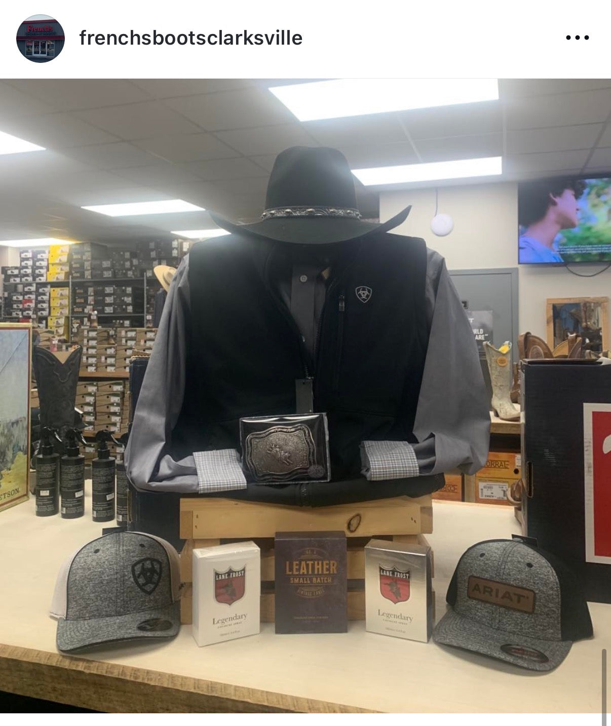 A homegrown shop carrying a selection of footwear, including cowboy boots, and hats.