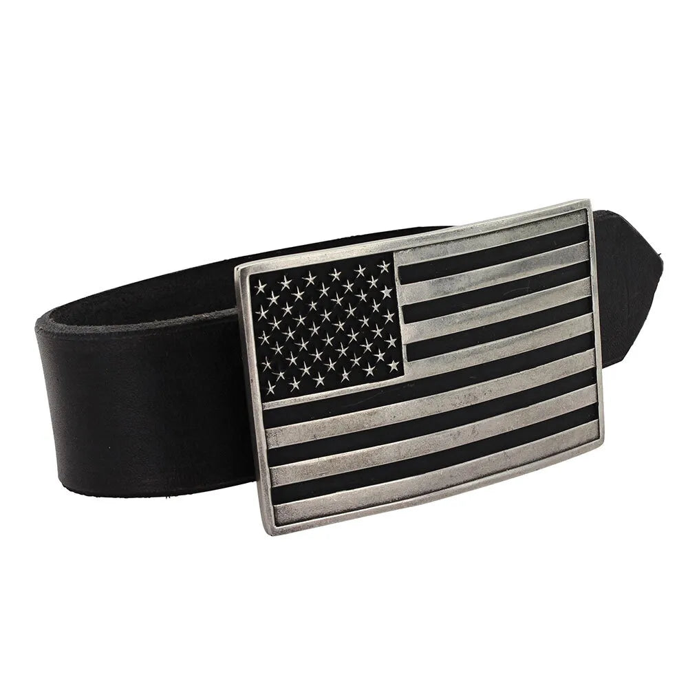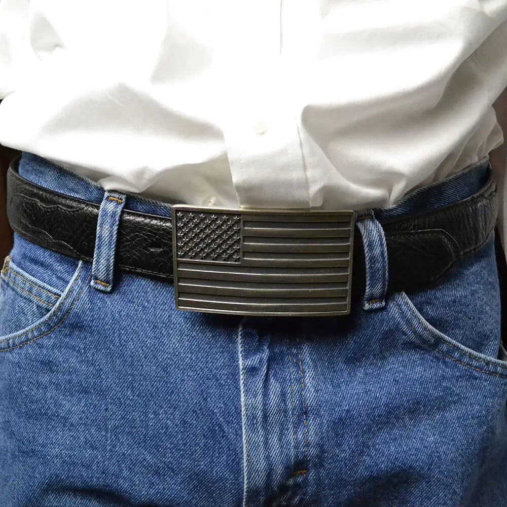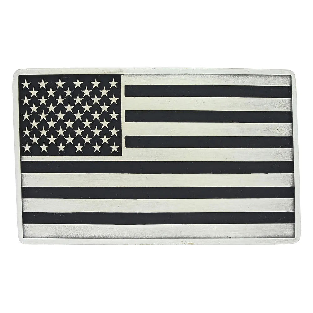 An antiqued silver finished rectangular cast Attitude buckle with an American Flag design. Silver toned stars dance across their traditional corner with the dark background matching the darker lines in the flag. Standard 1.5 inch belt swivel.