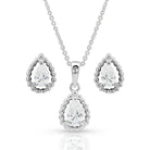 The arctic rain teardrop jewelry set features a bright clear cubic zirconia center stone with a border of smaller clear stones. The silver finished necklace and earrings make for a great everyday set of jewelry to add a little class to your wardrobe. Earrings have hypoallergenic stainless steel post backs. The necklace pendant hangs from a simple silver toned bail on a princess length, 19 inch chain.
