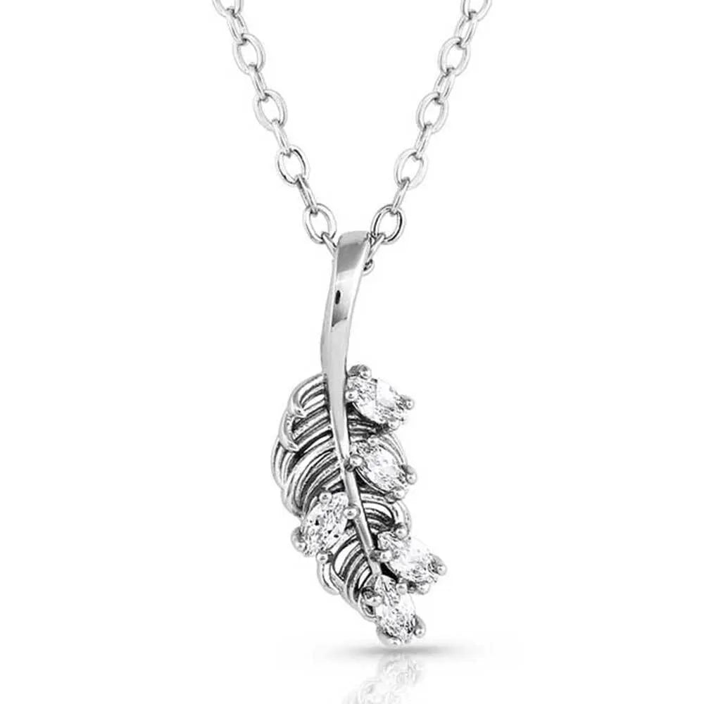 Exuding elegance, the Bridgerton Feather Necklace is timeless. A simple silver feather makes the pendant of the necklace. Five clear cubic zirconia crystals complement the feather and add subtle sparkle. The necklace dangles from a 19-inch chain.