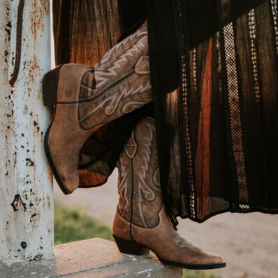 This is the women's 12" Fancy Stitch Distressed Brown and Tan Dream Catcherâ¢. This style is full-grain leather, with a soft mesh lining and a foam layer and sock lining cushion innersole for all day comfort. It has a tempered steel shank for stability, a rubber outsole with a vintage finish, a double row sole stitch around the narrow square toe and the leather wrap heel is 2" high. Step out in style in this eye catching distressed brown and tan Dream Catcher⢠style. Get a pair today!