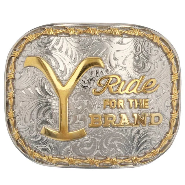 The ranch is everything in Paramount’s show Yellowstone and the Y brand is a symbol of that land and the Dutton’s home. Montana Silversmiths For the Brand Yellowstone Attitude buckle embodies that staunch loyalty. A squared buckle with rounded corners this Attitude Buckle is two-tone with a silver toned filigree backdrop to gold-toned letters. Upon the buckle is the iconic Y brand along with the words “Ride for the Brand”. To finish the design barbed wire borders the entire buckle. Standard 1.5 inch swivel.Materials-Silver and gold over a white metal alloy.
