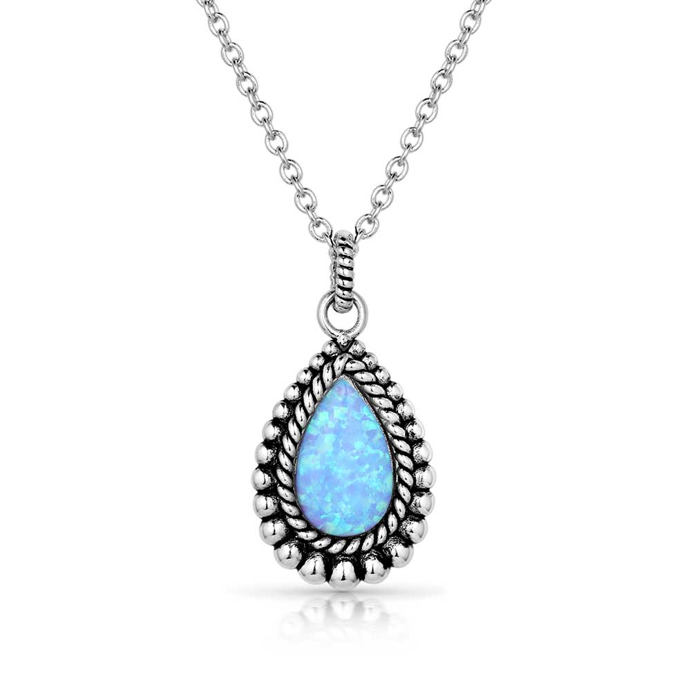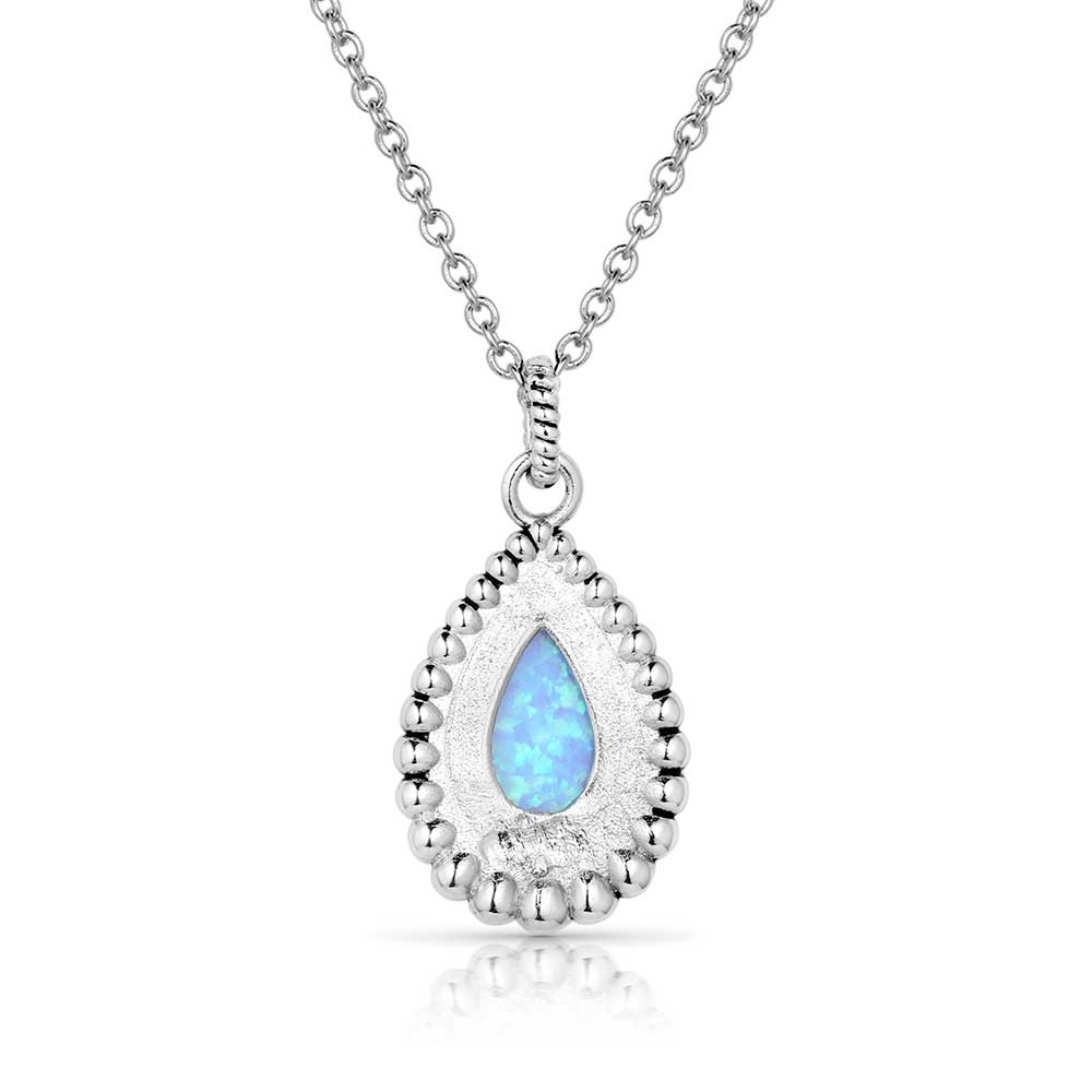Stunning and sophisticated, the Glimmering Pools Opal Necklace is a beautiful addition to your collection. The teardrop shaped necklace is created in a beautiful silver tone with a slight antiquing to bring out the details. The focal point of the necklace is a stunning opal stone that adds elegance and grace to the design. Framing the stone are silver tone beads of different sizes. The necklace is secured from a 19 inch silver tone adjustable chain.