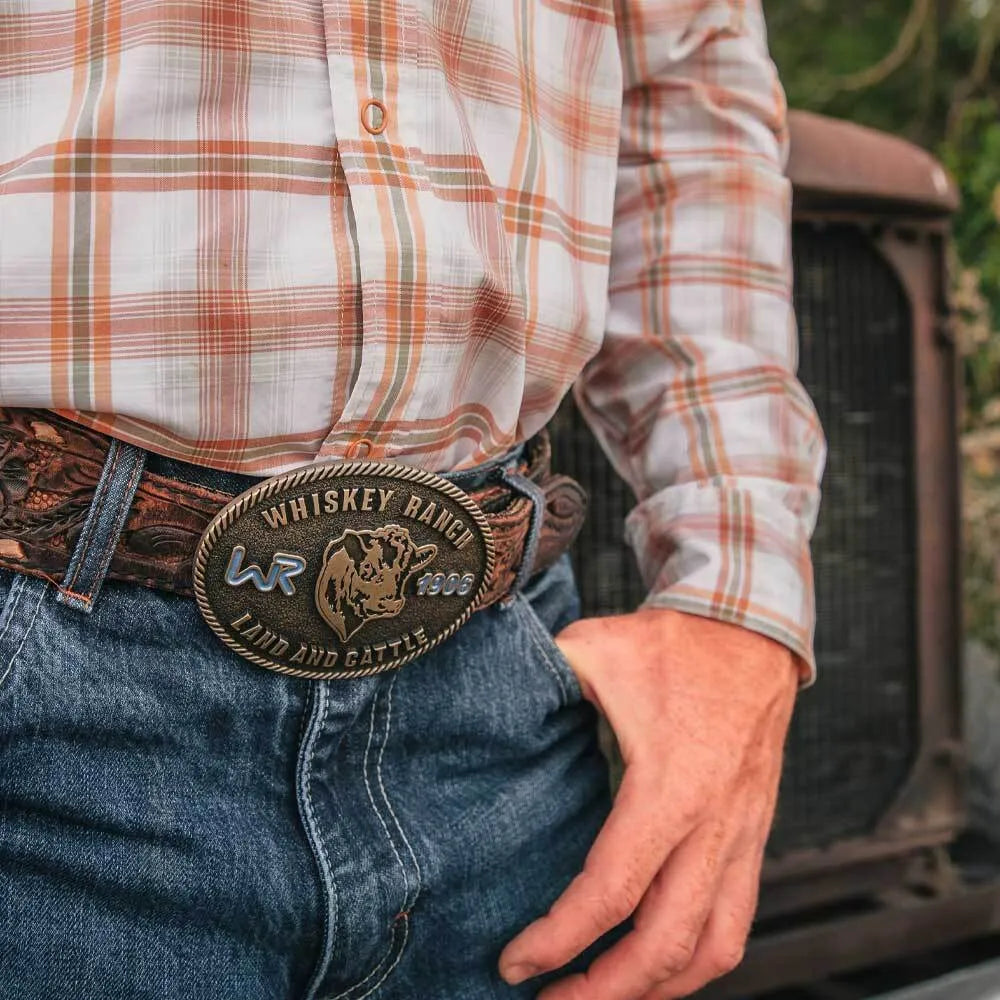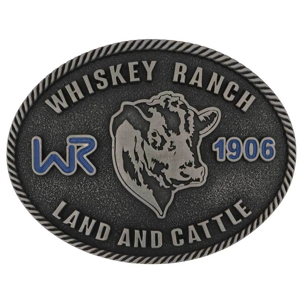 Show your love for land and cattle with the Land & Cattle Whiskey Ranch Buckle. This buckle features the words "Whiskey Ranch" at the top. The words "land and cattle" sit at the bottom of the buckle. A steer head is in the center of the buckle while the Whisky Ranch logo is on the left and 1906 is on the right with a bright blue paint adding color to the buckle. A silver tone roped border completes the look. Each buckle has a 1.5 inch back swivel.