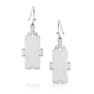 Enjoy the elegant Southwest style of the Looking Glass Turquoise Earrings. A beautiful silver tone frame surrounds a rectangular turquoise stone. The curled embellishments of the frame give a classic feel to the design. At the top of the vertical rectangular earring is a singular clear cubic zirconia crystal to add the finishing touch. The earrings are secured by a hypoallergenic French hook.