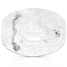 Step into the outdoors with Nature's Valor Buckle. This buckle features a vintage western design that showcases a buck and a doe in the center. A picturesque mountain range creates the backdrop for the deer. Silver toned floral engravings surround the image. A berried border adds depth to the piece, completing the look. This buckle has a 1.5 inch back swivel.