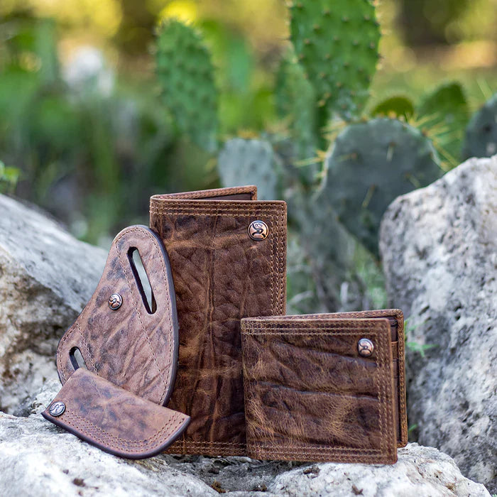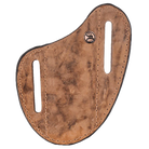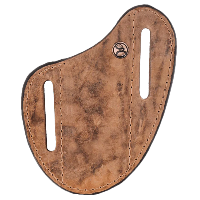 This Roughy pancake knife sheath features brown cracked bison leather with roughy logo rivet.