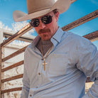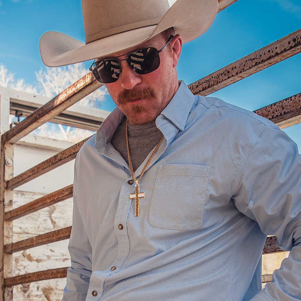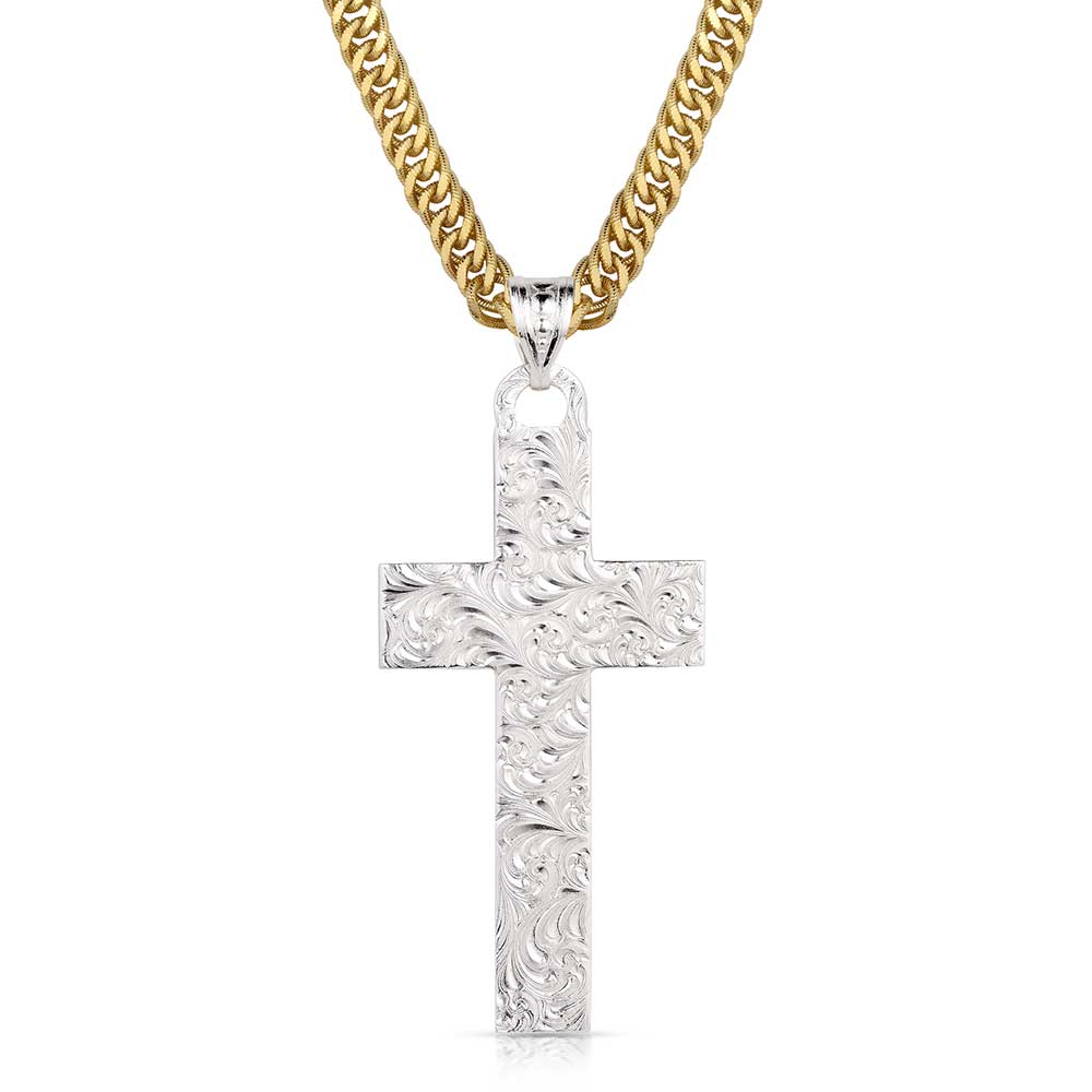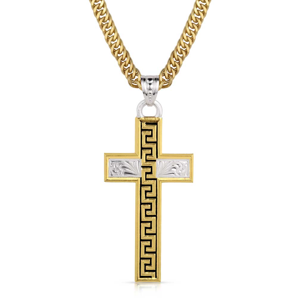Keep your faith close to your heart with the Sunrise Mesa Cross Necklace. This necklace features a geometric pattern in a yellow gold tone and black paint running down the center of the cross design. The arms of the cross feature striking silver tone engraving, adding contrast and Western flair to the pendant. The chain is a gold tone and 24 inches.