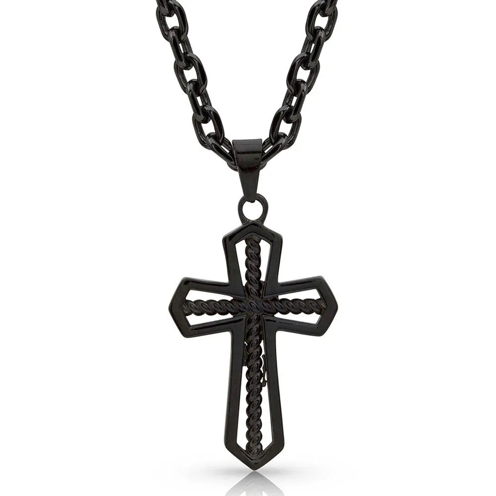 An open gunmetal black colored cross pendant necklace has an interior design of gunmetal black twisting rope that runs through each arm. The outside lines are a smooth line of the deep black color giving the necklace a modern, minimalist look. Necklace pendant rests on a matching chain with stations at 24, 26, and 28 inches.