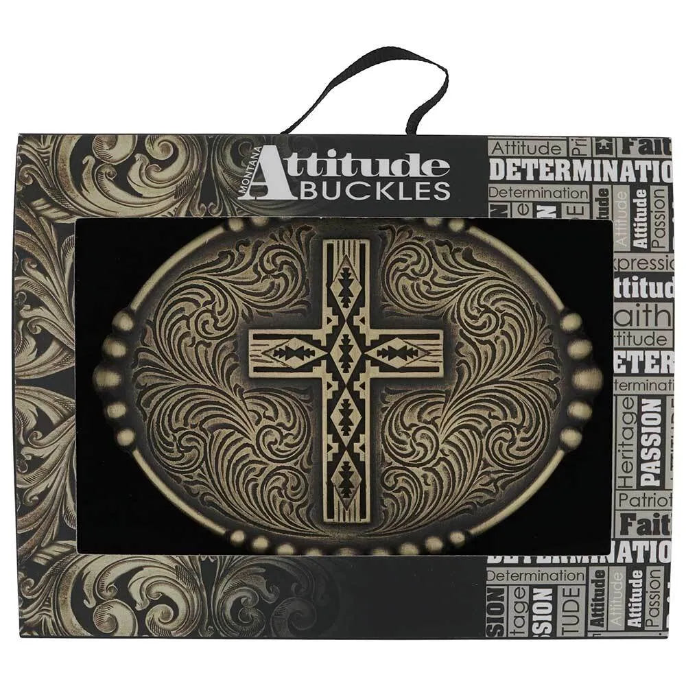 Be forever devoted with the Faith of the Southwest Buckle. This bronze tone buckle features a cross with Southwestern patterns in the center. Antiqued engravings make up the surface of the buckle, creating an eye catching display. A beaded design covers the top, bottom, and sides of the buckle. Each buckle has a 1.5 inch back swivel.