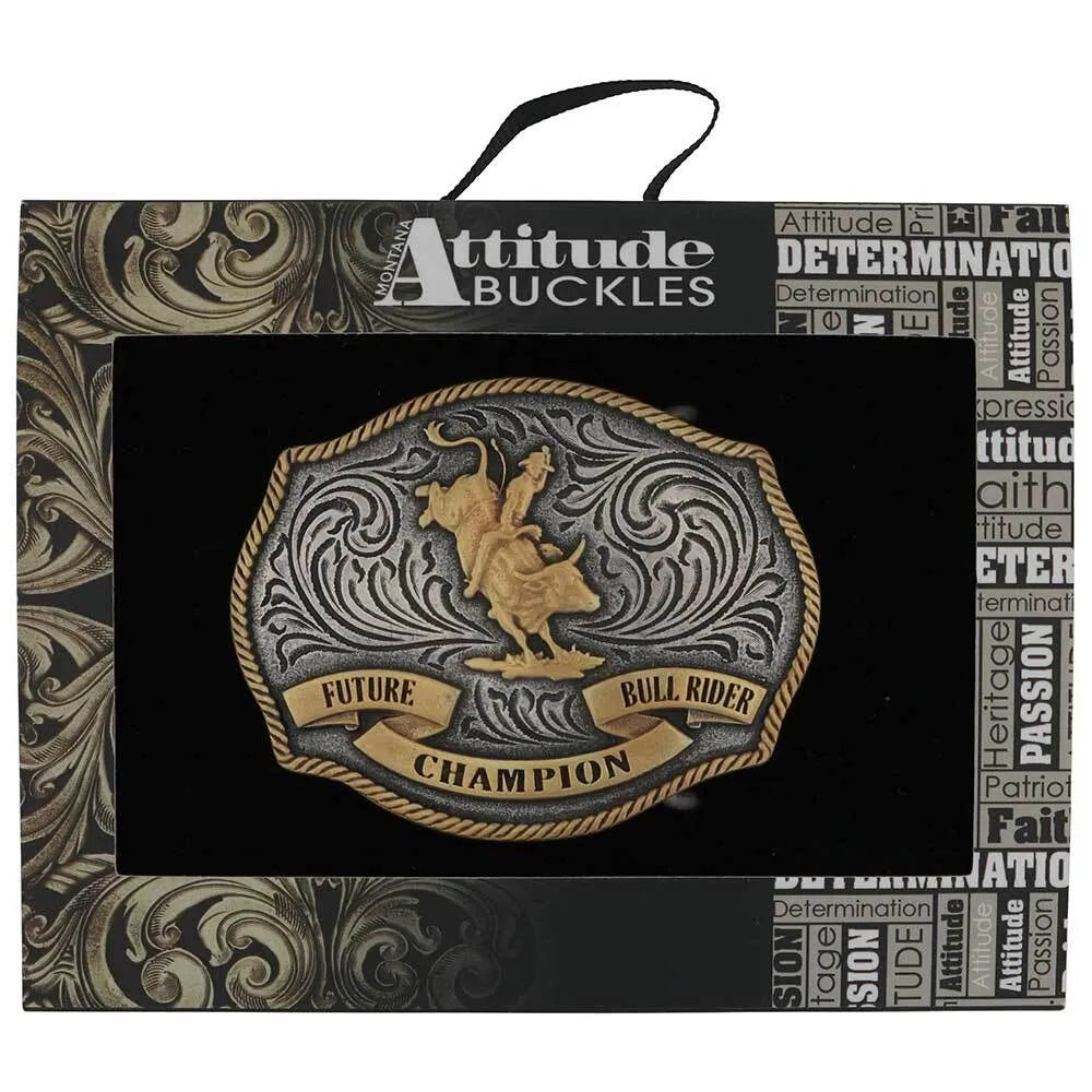 Be your own bull riding champion with the Future Bull Rider Buckle. This unique buckle features a gold tone bull rider figure in the center of the buckle. Silver tone engraved designs create the face of this buckle. The words "Future Bull Rider Champion" can be seen at the bottom. A stunning gold tone roped border creates the edge of the buckle, completing the design. The buckle has a 1.5 inch back swivel.