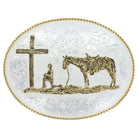 Oval shape western belt buckle with polished gold twisted rope trim. On the silver plate, a stippling frame circles around classic western bright cut style floral filigree with two flower accents engraved to perfectly fit around the large gold Christian cowboy figure kneeling before a cross while his horse stands patiently nearby. Standard 1.5 inch belt swivel.