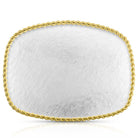 Inspired by the natural free flowing texture of rippling water, we love this good ol' classic belt buckle we call the Rippling Waters Custom Buckle. It is squared off, yet rounded in shape. It is silver-finished with a texture that resembles rippling water on the front. It is framed in a gold-finished rope detail. Standard 1.5 inch belt swivel.