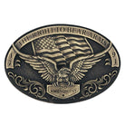 This Soaring Eagle Arms Belt Buckle is a flattened, oval-shaped cast Attitude buckle that is antique gold-finished. A soaring eagle is placed in the center holding the 2nd Amendment in his talons. The words "1791. The right to bear arms." is on a banner at the top of the buckle with an American flag flying in the wind behind it all. This buckle has a low-profile trim with scroll work decorating the bottom half. Standard 1.5 inch belt swivel.