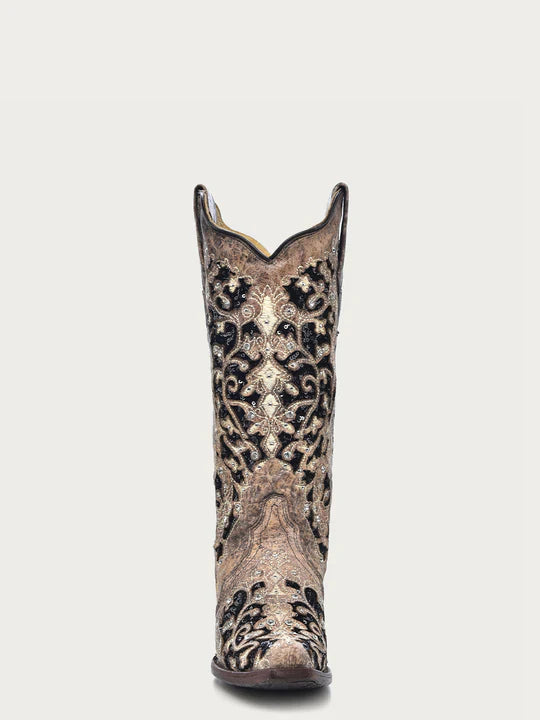 A3569 - WOMEN'S BLACK GLITTER INLAY FLORAL OVERLAY WITH CRYSTALS AND STUDS SNIP TOE BROWN COWBOY BOOT