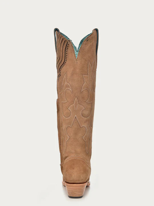 The tall sand color suede 15-inch shaft is highlighted by the embroidery pattern.