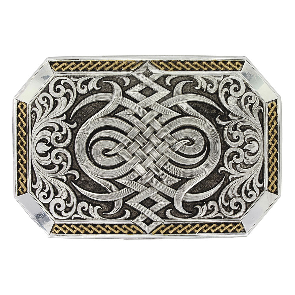 A unique antiqued rectangular octagon shape in silver and yellow gold tones creates an elegant buckle. Our designers take on a Celtic knot decorates the center of the buckle in a silver finish design, bookended by silver finished sideways heart's flame design with filigree scrollwork coming out from the sides. The silver designs are accentuated by the deeper antiqued background. The deep yellow gold finish finishes the buckle with a repeating diamond pattern trim on the sides with bright silver finished 'corner' bars. Standard 1.5 inch belt swivel.