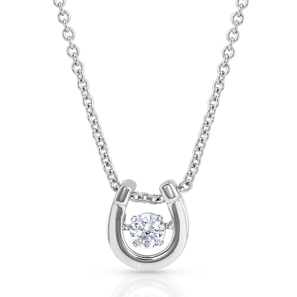 Our dancing birthstone horseshoe necklace is perfect for any cowgirl or those looking for a bit of luck, who has a birthday coming up. Set on a silver-toned chain, the bright silver-toned horseshoe highlights the beautiful colored birthstone in the color of your choice dancing in the center. It's perfect for everyday wear. Horseshoe pendant has a sliding bridge bail on a princess length, 19 inch chain.