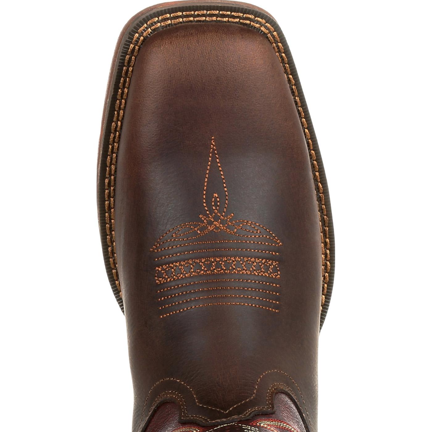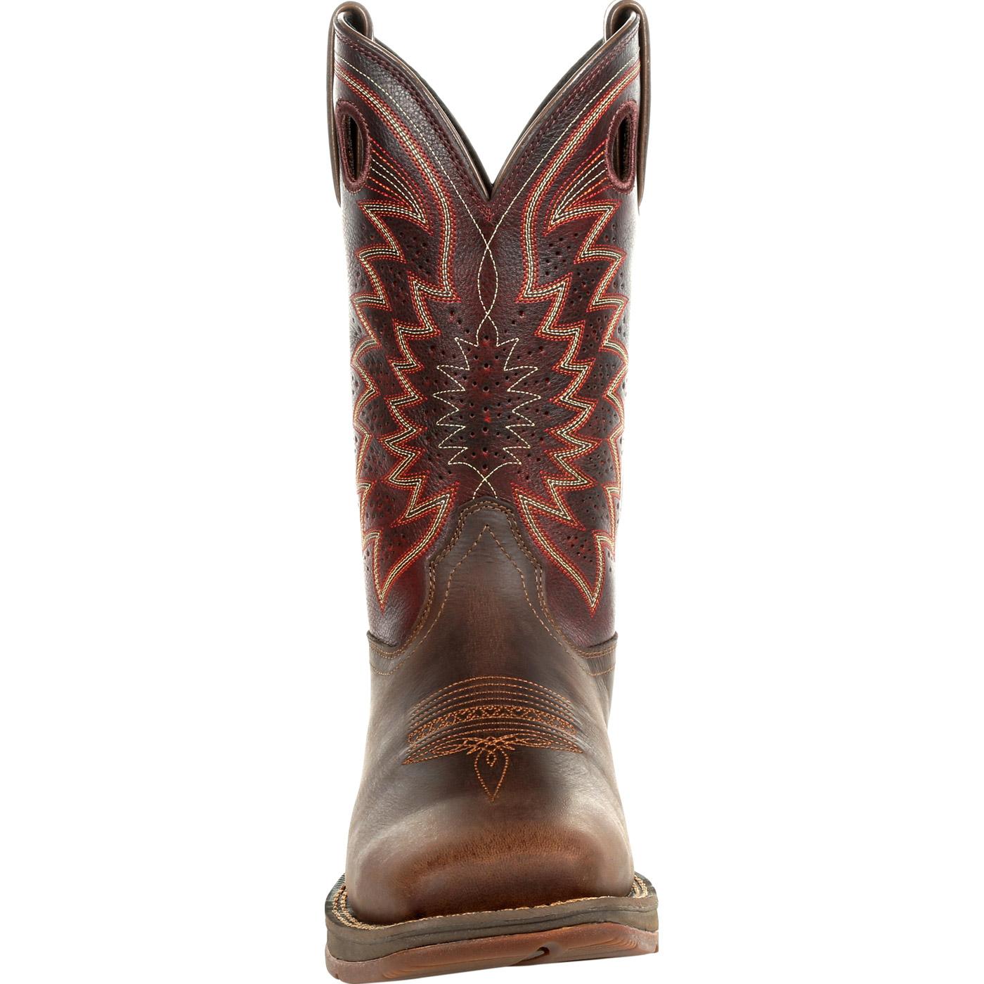 This is the men's 11" Western Ventilated Brown/Burgundy Durango® Rebelâ¢. This style is full-grain leather, features the Durango® X-Treme A.C.⢠ventilated shaft with an air mesh lining to promote maximum airflow, the Durango® X-Pand System⢠which is a hidden gore expansion for universal fit and easy on/off and the Durango® X-Treme Comfort footbed⢠with Memory Foam for all day comfort. This style also features a cushion flex insole, fiberglass shank which provides lightweight stability and the rolled shank area allows easy placement in the stirrup. The molded EVA midsole is lightweight and flexible, and the outsole is slip and oil resistant, dual-density and abrasion resistant rubber. This style also features a double row sole stitch, 1 ½" rocker heel and square toe. Pull on all-day comfort in this Durango® Rebel⢠style. Get a pair today!