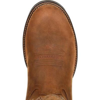 This is the men's 12" Western Waterproof Coyote Brown Rebel. This style has distressed full-grain leather with a waterproof membrane bootie inside to keep your feet dry all day long. It has a contoured, ventilated, and removable cushion footbed, cushion flex insole, a fiberglass shank and a rolled shank area for easy placement in the stirrup. It has a lightweight and flexible molded EVA midsole, slip and oil resistant, dual-density and abrasion resistant rubber outsole with a double row sole stitch for added durability, 1 ½" rocker heel and a round toe. This boot is ready to tackle any job on the farm. Get the men's 12" Waterproof Round Toe Rebel today!