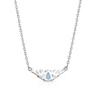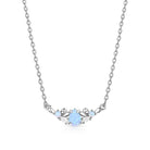The delicate nature of this necklace gives it an aura of elegance and grace. The stunning necklace features a center oval blue opal stone serving as the focal point of the design. On the left and right sides of the center stone are stunning silver tone flourishes with clear cubic zirconia crystals adding an element of sophistication to the piece. On each end are small blue opals which attach to the 18 inch adjustable split chain to finish the piece.